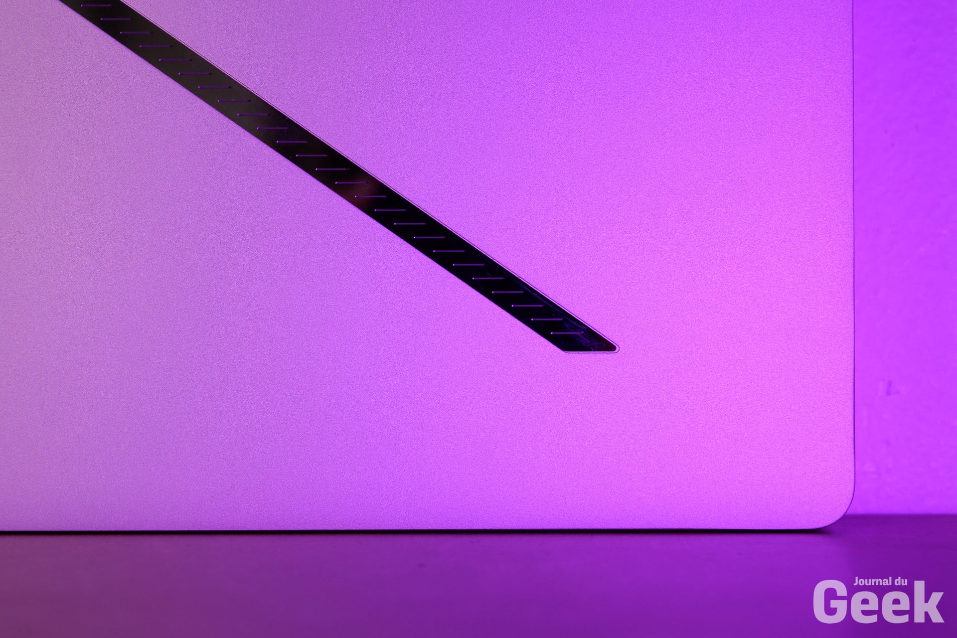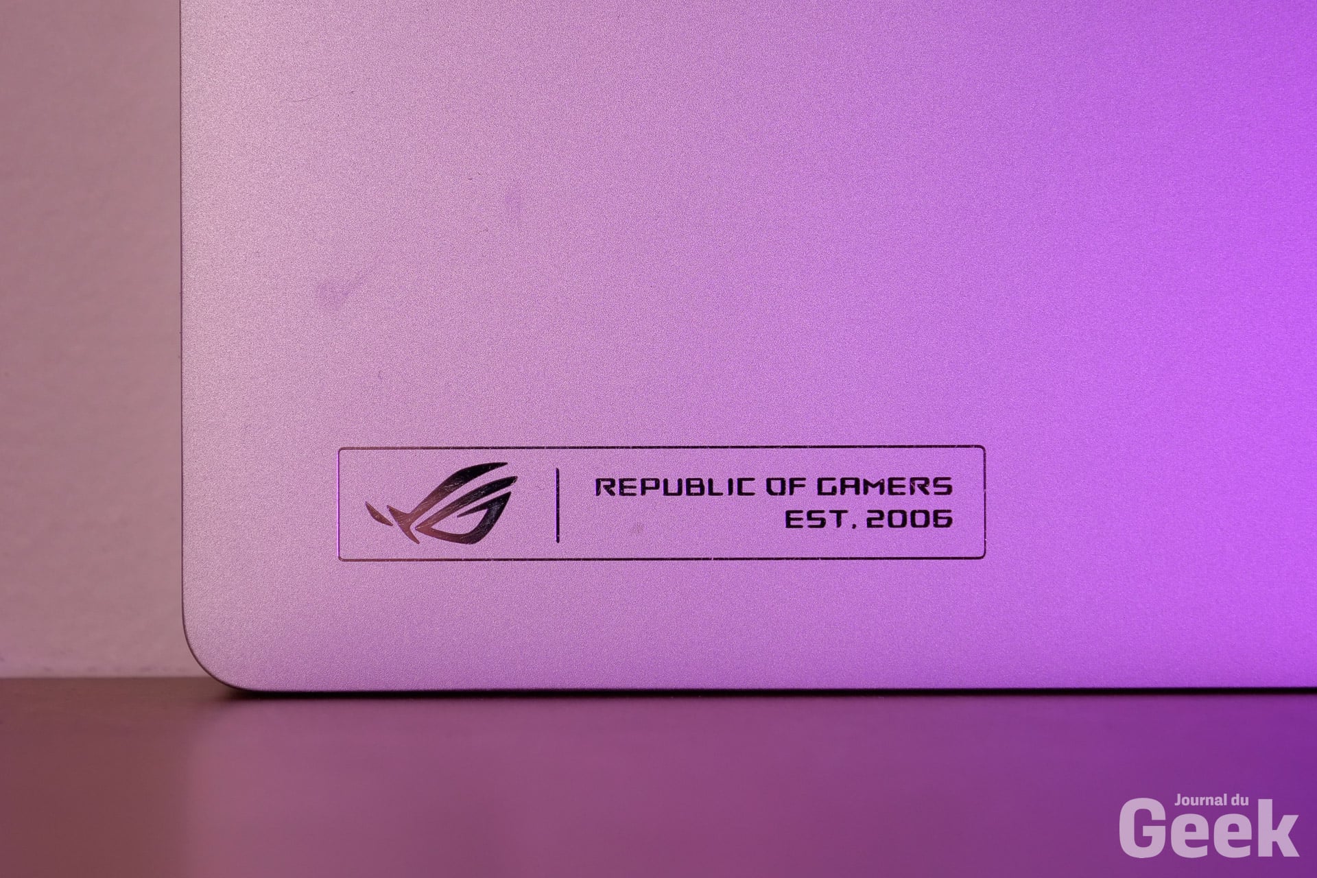 Oui parce qu’en plus de la finesse, l’Asus Zephyrus G14 est également très léger avec un poids de 1,57 kg seulement. On rappelle qu’on parle d’un PC portable de gaming, hein ? Donc oui, dans l’univers des ultrabooks, on a maintenant plus léger, mais on reste dans la catégorie des PC portables de gaming, on reste dans la catégorie des poids plume et c’est d’autant plus impressionnant. Dans tous les cas, le poids est bien réparti sur l’ensemble de la machine. Si le design est plus mature, on retrouve tout de même une finition excellente.