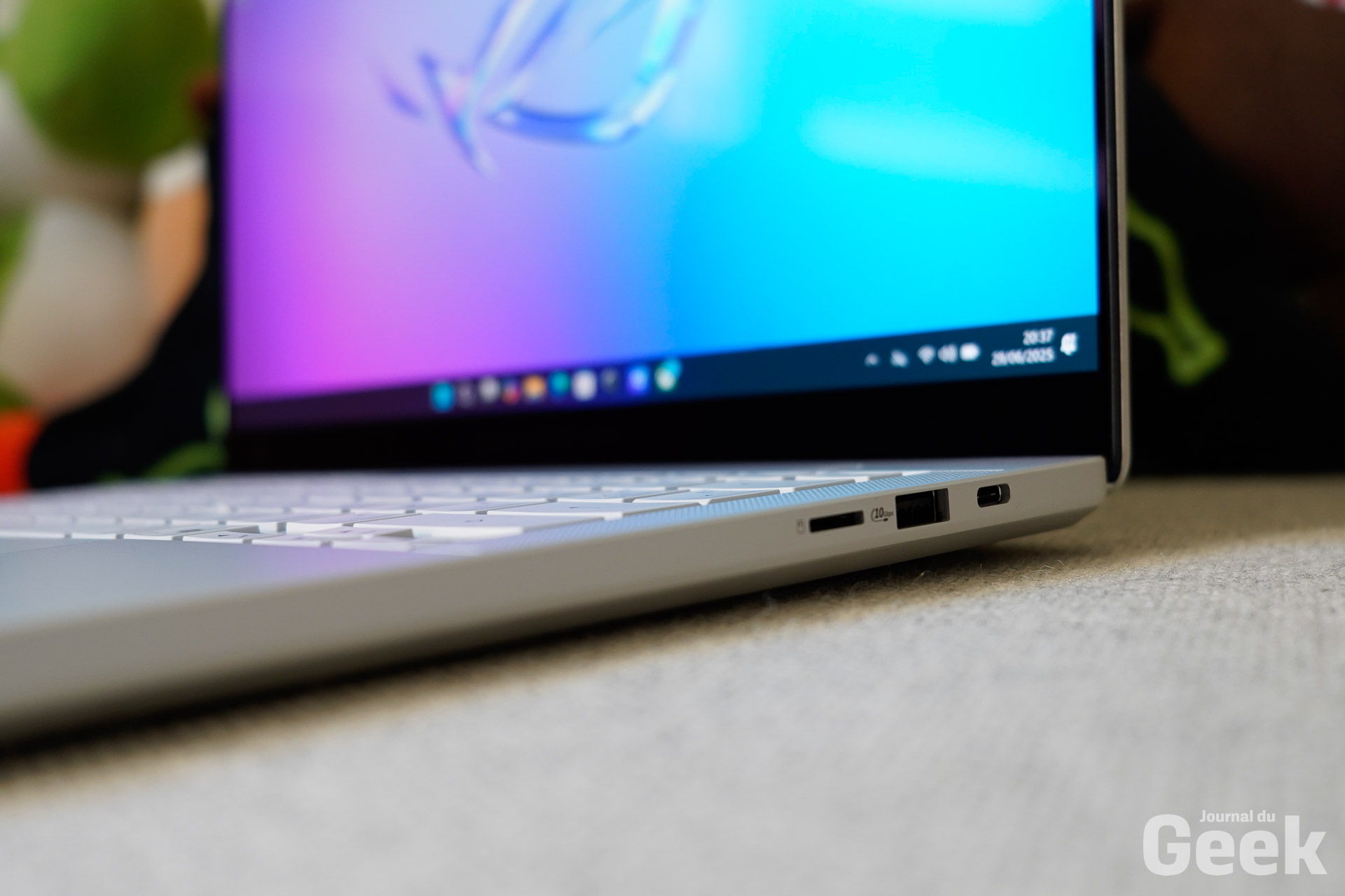 La connectique est un des points forts du ROG Zephyrus G14. On retrouve ainsi un port USB 4 Type-C avec DisplayPort et Power Delivery, un port USB 3.2 Gen 2 Type-C, deux ports USB 3.2 Gen 2 Type-A, une sortie HDMI 2.1, un lecteur de carte microSD et un port jack 3.5mm. On l’aura compris, il y a tout ce qu’il faut pour les photographes et les vidéastes, mais aussi pour les gamers. On notera également un trackpad assez large mais en revanche, on regrette l’absence d’un port SD classique, mais le lecteur de carte microSD est déjà un bon compromis pour ceux qui utilisent des drones ou des smartphones.